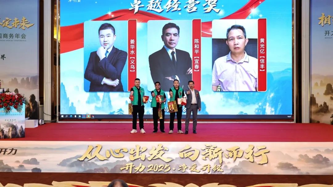 接着闪亮登场的是开力2024年度卓越经营奖。他们高度重视经营结构,以卓越的市场拓展能力、服务能力主推开力高端产品,做出骄人的业绩贡献,堪称开力价值营销的典范。荣获该奖项的优秀伙伴是:开力义乌运营中心的姜华水、开力宜春运营中心的陈和平、黄慧慧夫妇、开力信丰专卖店的黄光亿。