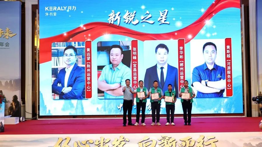 接着颁发的是开力2024年度新锐之星奖。开力厨电事业的蓬勃发展,不仅靠老伙伴的持续付出、奉献和标杆引领,也需要新伙伴的共襄盛举。一批加盟开力事业时间虽短,但却以坚定的信念,高度的热爱出色的努力拼搏,在短短的时间里,取得不俗的优异业绩。他们就是本届年会表彰的新锐之星们:开力荆州运营中心的黄远望、开力宜昌运营中心的张明锋、开力郴州运营中心的李华彬、开力河源服务中心的黄斯越。