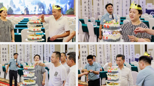 荣耀时刻后,盛大的答谢晚宴温情开启。晚宴中,灯光渐暗,熟悉的生日歌旋律突然响起!两位当天生日的开力家人在毫不知情中被请上舞台。开力家人齐声高唱生日歌,祝福声浪此起彼伏。这份精心准备的惊喜,让两位寿星感动不已。在温馨的歌声中,李董、李总裁与寿星共同切下蛋糕,分享甜蜜,将开力“家”的温暖传递给在场的每一位伙伴。