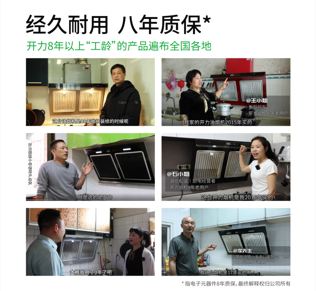 大量用户反馈,开力烟机使用8年以上仍吸力强劲、无需拆机清洗,产品稳定性与耐用性远超预期,形成 “用过即推荐” 的良好口碑传播效应。开力油烟油电分离烟机的“高效长效净油净烟净味”效果符合市场对“长效净厨”的期待。