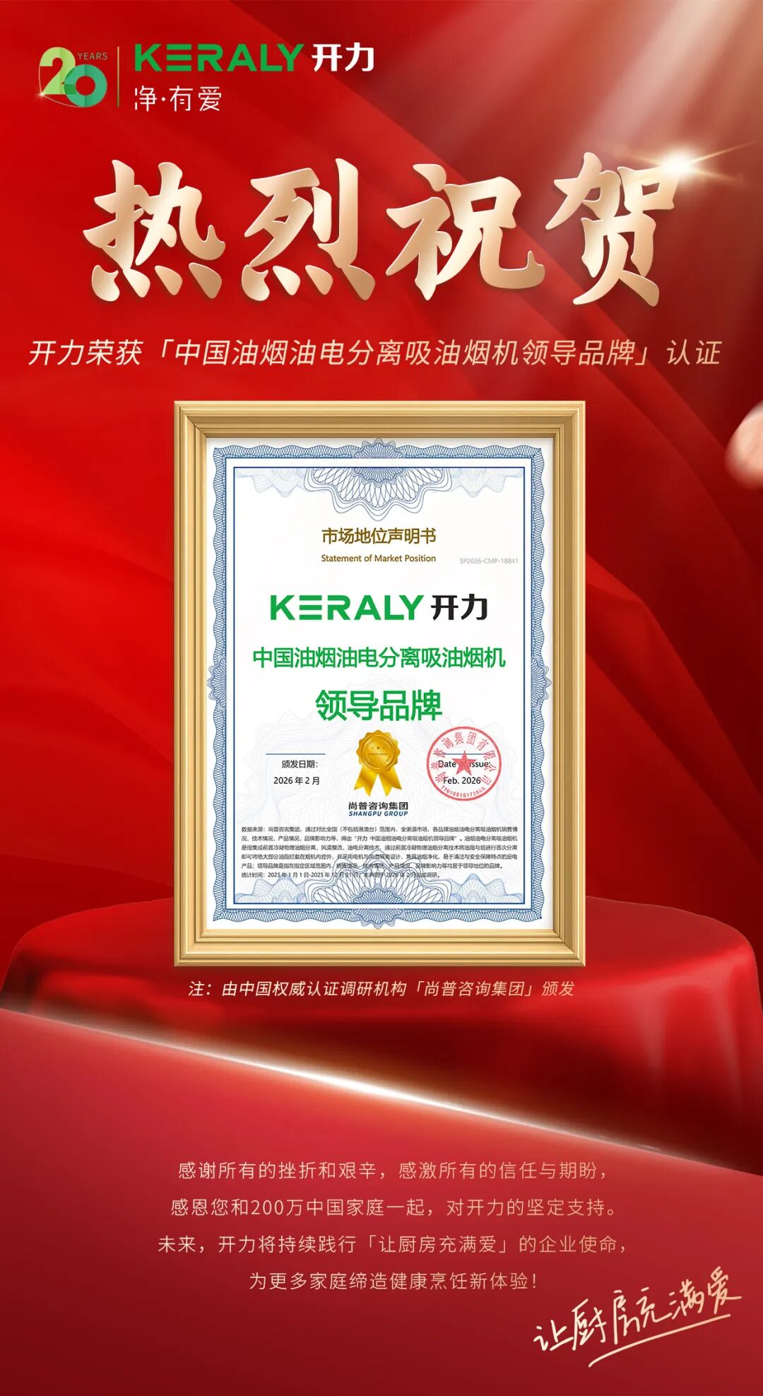 二十年专注油烟油电分离,只为想你所想,痛你所痛,爱你所爱。“中国油烟油电分离吸油烟机领导品牌”的荣誉加冕对开力而言,既是认可,更是沉甸甸的责任。感谢所有的挫折和艰辛,感激所有的信任与期盼,更感恩您和200万中国家庭一起,对开力的坚定支持。