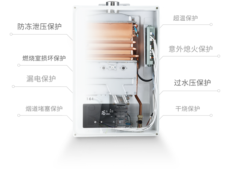 开力燃气热水器具有多达十四重安全保护,为求给您带来安心安全的沐浴体验。